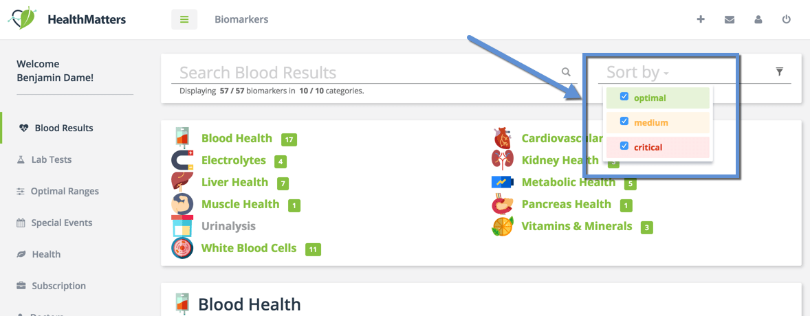 - Sorting Biomarkers by status: Users can now sort their biomarkers by optimal, medium and critical on their personal dashboard. Login or create an account, upload your biomarkers and check out your updated dashboard for the sorting function. We believe that this will be a very important feature to see the status of your blood at a glance and helps you to focus on the biomarkers that matter the most for you.