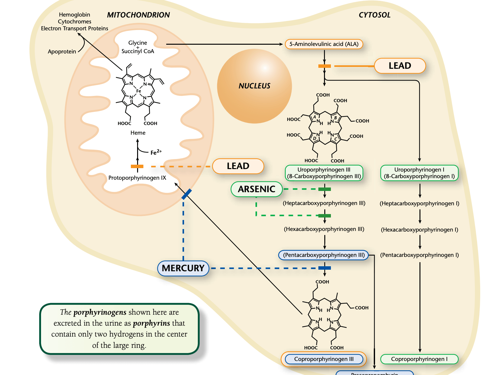 Porphyrins appear elevated in urine when the cellular pathway for heme synthesis is blocked by natural or man-made toxicants or when genetic disorders that affect the enzymes of the porphyrin pathway are present.