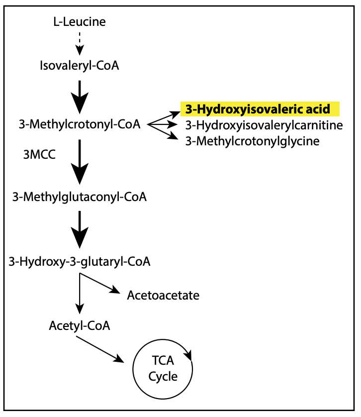 3-Hydroxyisovaleric Acid (3-HIA) is formed from the metabolism of the branched-chain amino acid leucine.nMethylcrotonyl-CoA carboxylase catalyzes an essential step in this pathway and is biotin dependent. Reduced activity of this enzyme leads to an alternate pathway of metabolism resulting in 3-hydroxyisovaleric acid.