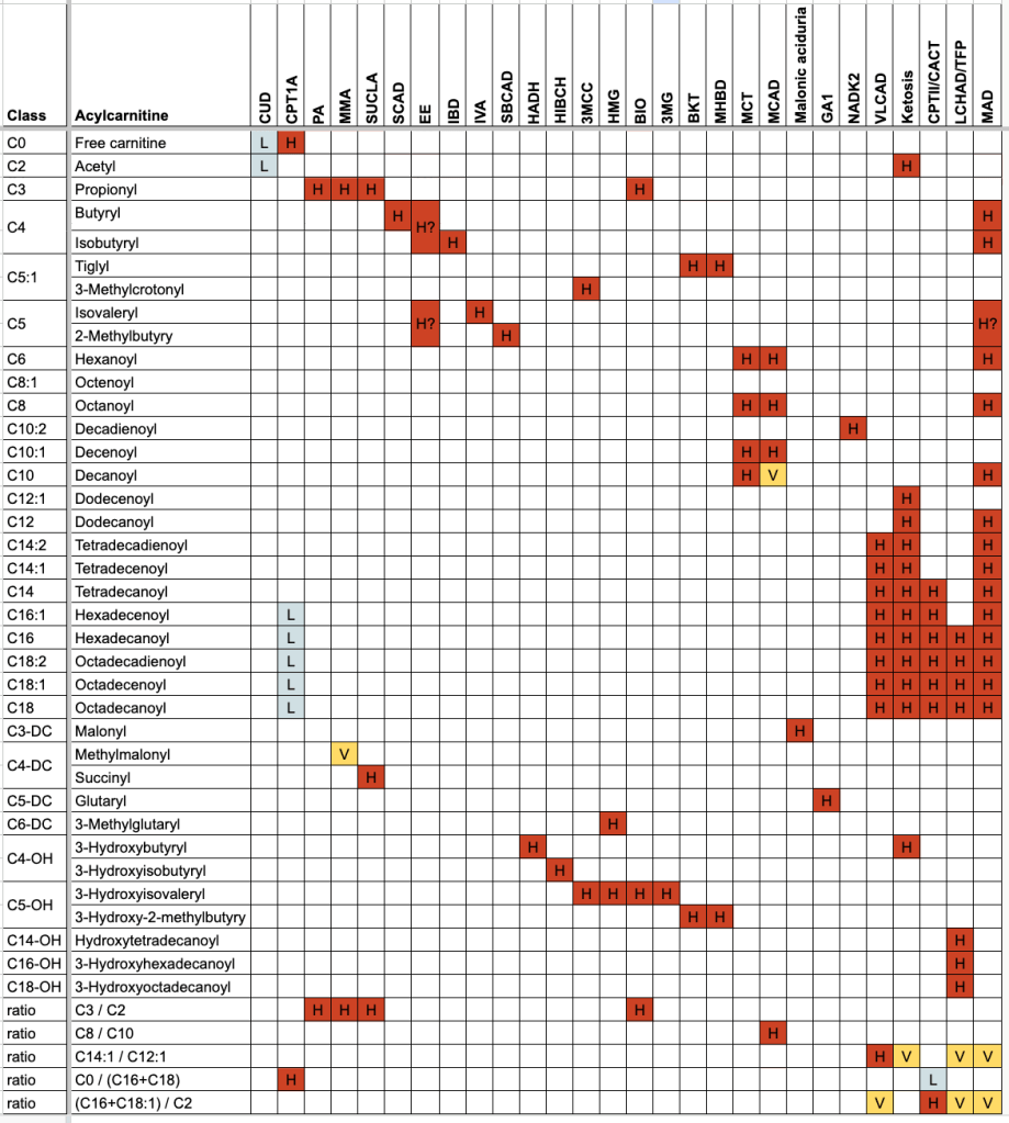 | Class | Acylcarnitine | CUD | CPT1A | PA | MMA | SUCLA | SCAD | EE | IBD | IVA | SBCAD | HADH | HIBCH | 3MCC | HMG | BIO | 3MG | BKT | MHBD | MCT | MCAD | Malonic aciduria | GA1 | NADK2 | VLCAD | Ketosis | CPTII/CACT | LCHAD/TFP | MAD |