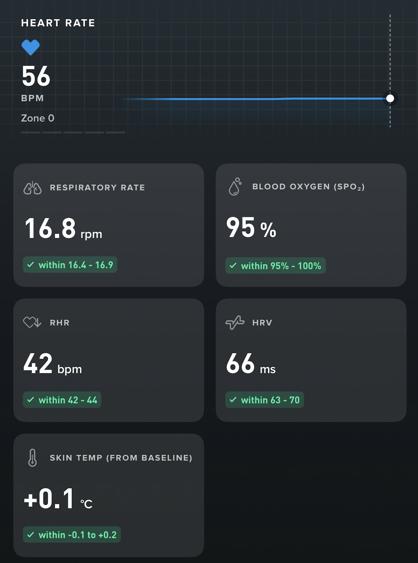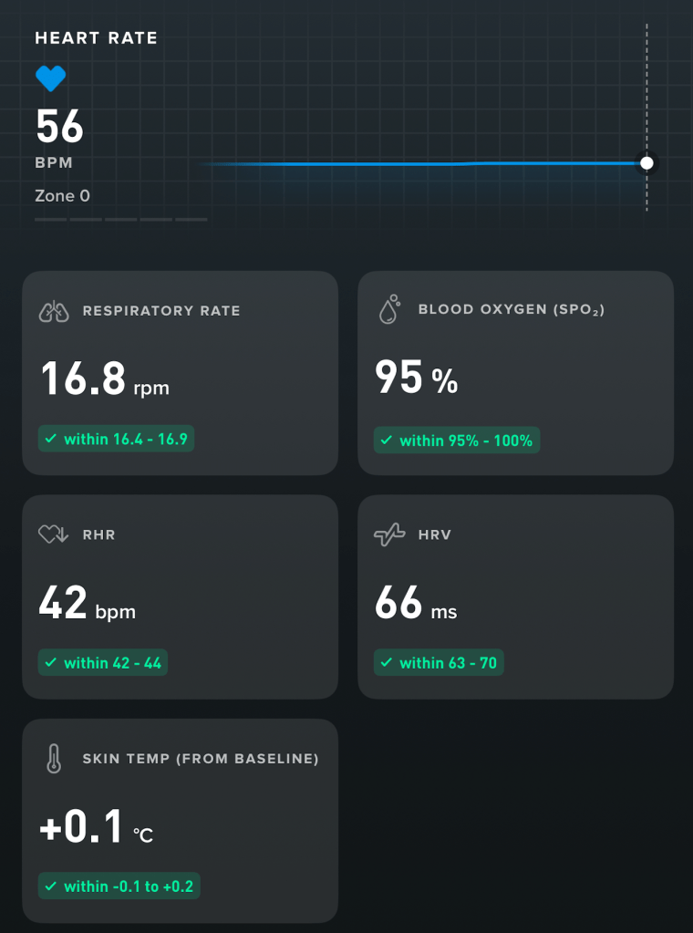 - Strain, recovery, resting heart rate (RHR), and activity metrics from WHOOP bands
